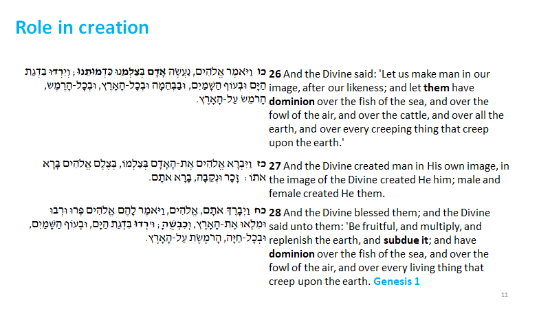 What have we done with the word, dominion? Well In Genesis Rabah 8:12, a commentary on Genesis written 2000 years ago, Rabbi Chanina and Rabbi Ya’akov of K’far Chanin discuss having dominion over the fish in the sea etc. Rashi, the brilliant explainer of text, writing in the Middle Ages makes this clear (Pashat) for the rest of us. The Hebrew ְיִרְדּוּ